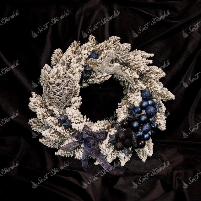 Tenhle unikátní kousek stoprocentně spadá do kategorie „moderní vánoční věnec na dveře“. Učebnicově zvoleny tmavomodrý ozdoby kontrastující se zasněženým věncem jsou oku lahodící kombinace. Zákaznice pro výzdobu zvolila různé odstíny tmavě modré, některé ozdoby přecházejí téměř až do černé barvy. Modré vánoční koule a hvězdičky jsou doplněny o dvě tmavomodré mašle, které dotvářejí nádherný přechod mezi modrými a stříbrnými třpytivými ozdobami. Decentně zvolené stříbrné ozdoby v podobě srdíčka a soba téměř splývají se zasněženým korpusem vánočního věnce. Pokud takhle vyzdobený vánoční věnec pověsíte na vchodové dveře, garantujeme vám, že se nad ním pozastaví každý kolemjdoucí.