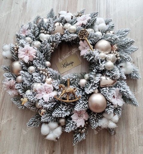 Přemýšlíte nad tím, jaké použít vánoční ozdoby na věnec? Čím dál, tím modernější se stává barevná kombinace bílé a růžové. Tenhle zasněžený vánoční věnec hustě ozdobený v jemných barvách je jistě důkazem toho, že světlé barvy nádherně ukážou i na bílém korpusu vánočního věnce. Věnec je vyzdobený bledě růžovými květinami v kombinaci s vánočními koulemi přecházejícími ze stříbrné do zlaté barvy. Do detailu je věnec dotáhnutý díky zlatým srdíčkům a hvězdičkám podpořenými zlatým klíčkem a houpacím koněm. Takhle bohatě ozdobený vánoční věnec ozdobí jakýkoli prostor, kam ho umístíte. Nezáleží, jestli si z něj uděláte vánoční věnec na stůl nebo dveře, vaši sváteční atmosféru jenom znásobí a bude vás těšit kdykoliv se na něj podíváte.