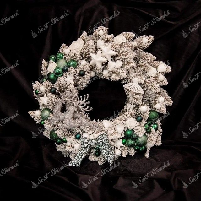 Tady máme pro vás další inspiraci, jak by mohli vypadat vánoční věnce na dveře. Opět tady máme zasněžený vánoční věnec, který je ozdobený dekoracemi v rozličných odstínech zelené barvy. Zelené vánoční koule jsou v různých převedeních, od světle zelených po ty tmavé, od matných až po ty třpytivé. Společnost zelené barvě dělá i barva sněhově bílá, ve které jsou dělaný hvězdičky, srdíčka a květiny. Určitě nepřehlédnutelnou součástí tohohle věnce je pár stříbrných třpytivých sobů v těsné blízkosti zeleno-bílé mašle. Taková výroba vánočního věnce netrvá pár minut, ale výsledek stoprocentně stojí za to. Kdokoliv uvidí tenhle věnec, řekne si, že jeden takový nutně potřebuje. Použít jen lze jako vánoční věnec na dveře vchodové nebo interiérové, vánoční věnec na stůl nebo komodu, a taky ním můžete ozdobit poličku nebo parapet.