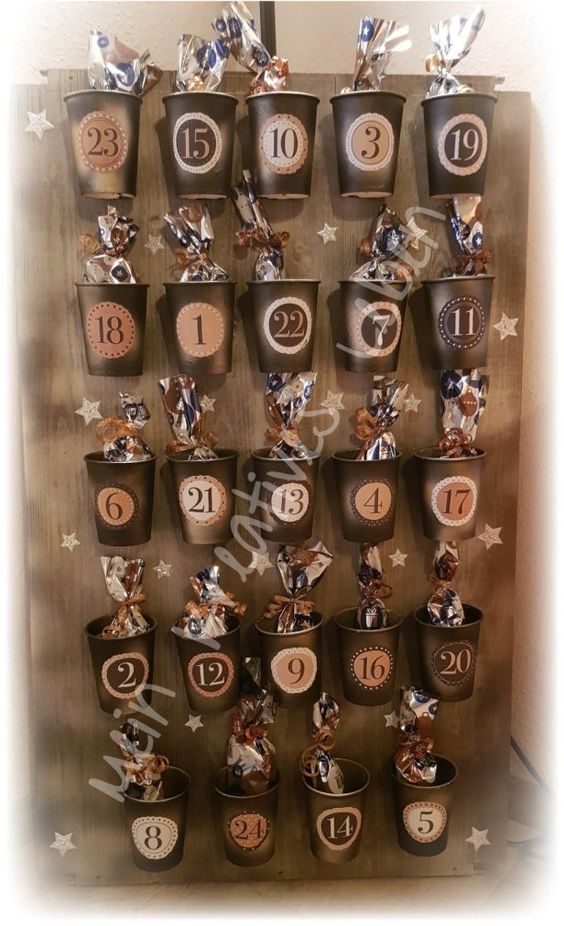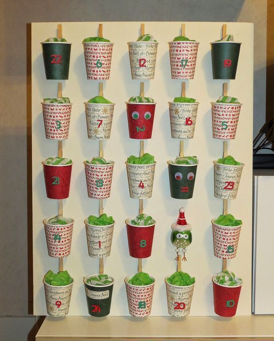 Na výrobu adventního kalendáře se dají krásně využít i papírové kelímky. Kelímky si v první řadě vyzdobíme podle vlastní fantazie a na každý kelímek napíšeme nebo nalepíme číslo od 1 do 24.