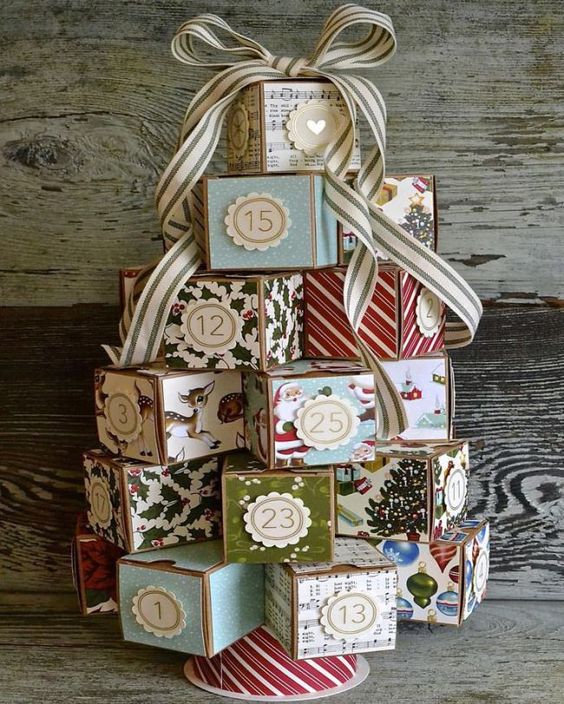 Pokud se rozhodneme pro tento typ adventního kalendáře, je potřebné si předem odložit papírové krabičky v různých velikostech. Tyto krabičky si následně obalíme do vánočního papíru různých motivů a napíšeme čísla do 1 do 24. Elegantně vypadá i adventní kalendář, v němž si krabičky obalíme do přírodního hnědého balicího papíru a následně je dozdobíme stužkami, krajkami nebo jinými ozdobami.