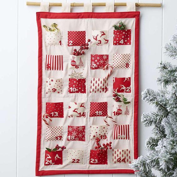 Na začátku potřebujeme větší kus podkladové látky, na kterou budeme našívat 24 kapsiček. Kapsičky si vytvoříme z dalších látek v různých barvách s různými motivy. Z látek si vystřihneme obdélníkové nebo čtvercové tvary v různých velikostech, které budeme následně přišívat na podkladovou látku. Kapsy přišijeme z bočních a spodní strany tak, abychom do nich mohli svrchu vkládat dárky. Tento kalendář můžeme dětem zavěsit na stěnu nebo dveře.