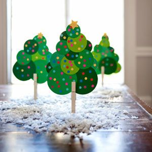 Ze zeleného barevného papíru si vystřihneme tvar prodlouženého trojúhelníku. Ten následně poskládáme jako harmoniku. Když máme papír složený, přesně uprostřed ho propíchneme špejlí. Papír následně rozprostřeme a tím nám na špejli vznikne jednoduchý zelený stromek.