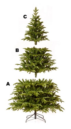 Vezmeme spodní část stromečku (největší část A) a otočíme ji směrem nahoru. Řada za řadou, zatlačíme na doraz nohy stojanu do předurčených otvorů. Přesvědčíme se, zda jsou nohy zasunuty správně, stromeček obrátíme a položíme ho stojanem na zem.