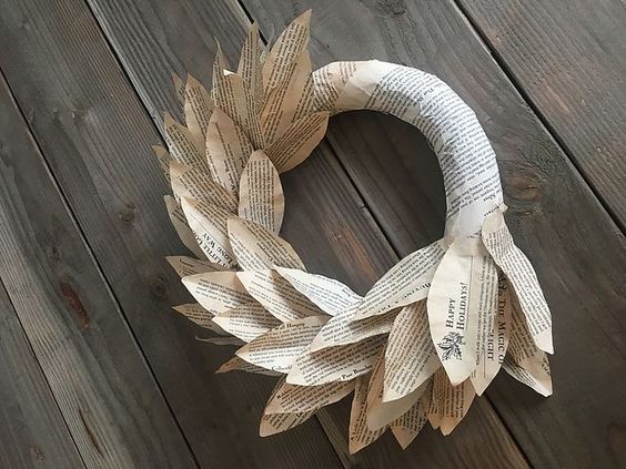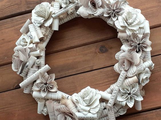 Mezi netradiční, moderní adventní věnce můžeme určitě zařadit adventní věnec z papíru. Je jen na vás, jestli si takový věnec vyrobíte z klasického bílého papíru, nebo ze starých novin. Základem je, kousky papíru poskládat do ruliček, případně nakrčit a upevnit je do tvaru věnce. Papír můžete lepit buď na karton, polystyrenovou maketu, nebo je připevňovat na drát.