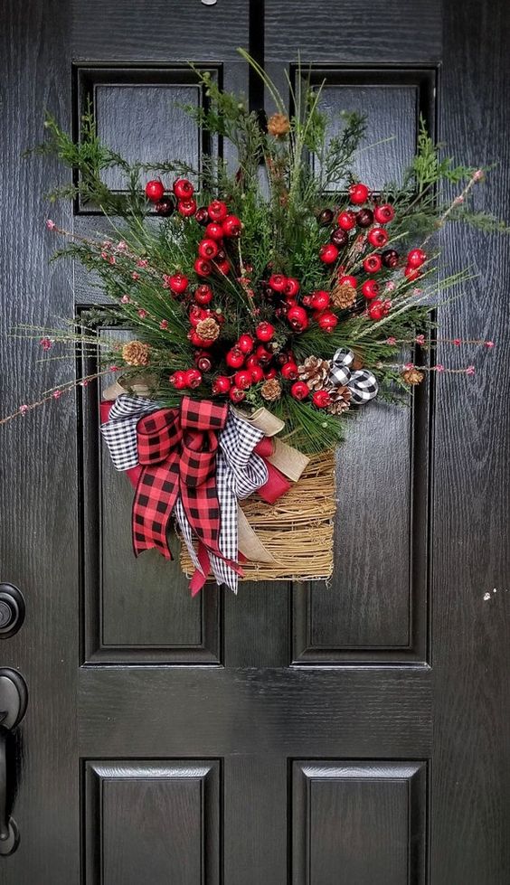 Stejně skvělým tipem na výzdobu dveří je slaměný košík upevněný na dveřích, do kterého naskládáte chvojí, šišky a červené plody. Celou dekoraci můžete dotvořit ještě stužkami. Jak jednoduché však?