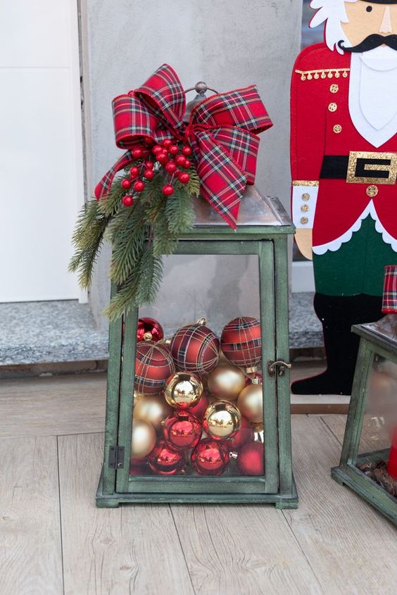 Skvělým tipem pro vás je naplnit starou lucernu vánočními koulemi a na vrch lucerny připevnit chvojí, šišky, či mašli. Taková vánoční dekorace ke dveřím se bude krásně vyjímat před vašimi vchodovými dveřmi.