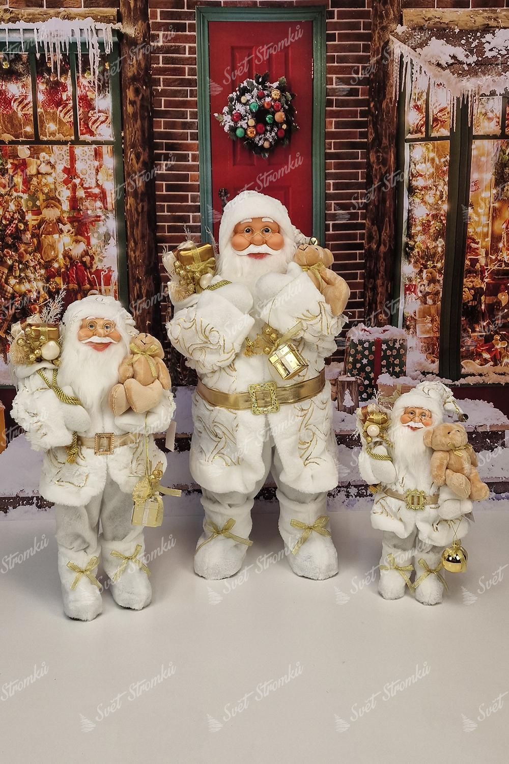 Luxusní bílo-zlatý vánoční Santa Claus je dostupný ve velikostech 40 cm, 60 cm a 80 cm.