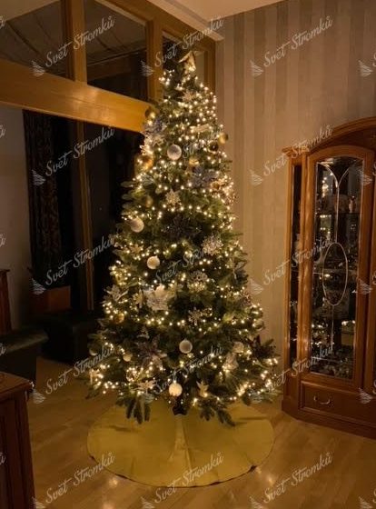 umělý vánoční stromeček 3D, výška 240cm, šířka 150cm, typ jehličí 3D (PE) + PVC, jedlové 3D jehličí přirozeně zelené barvy, provedení – hustý, délka špičky 20cm, kovový stojan, počet částí – 3