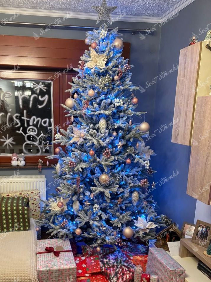 Bílý vánoční stromeček, výška 240 cm, šířka 144 cm, typ jehličí – zasněžené 3D + PVC, provedení – hustý, délka špičky 20cm, kovový stojan, počet částí – 2