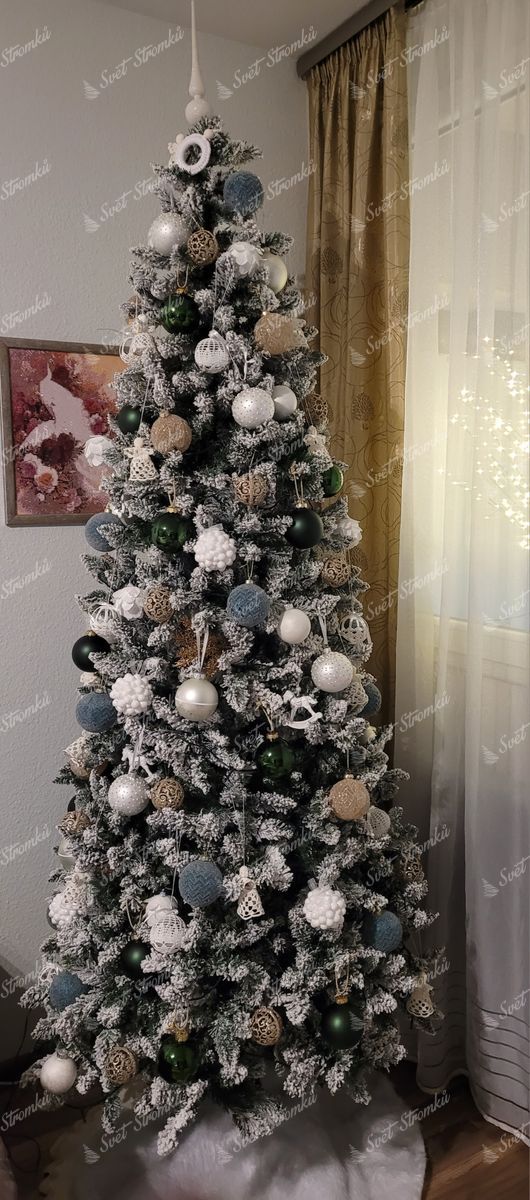 Smrk Bílý Úzký je moderní umělý vánoční stromek, který potěší všechny, kteří hledají zasněžený, vánoční stromek úzkých rozměrů. Vyznačuje se úzkým tvarem, díky čemuž se vejde i do stísněných prostor. Stromek je vyrobený z kvalitních, borovicových PVC větviček, přirozeně zelené barvy, které jsou hustě zasněžené umělým sněhem.