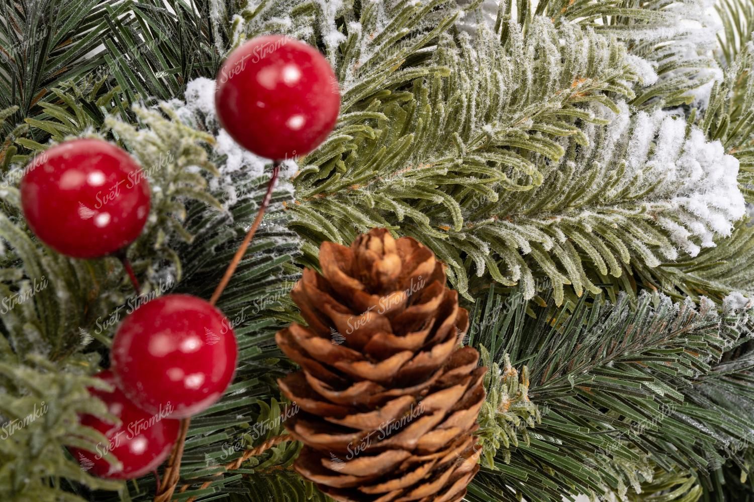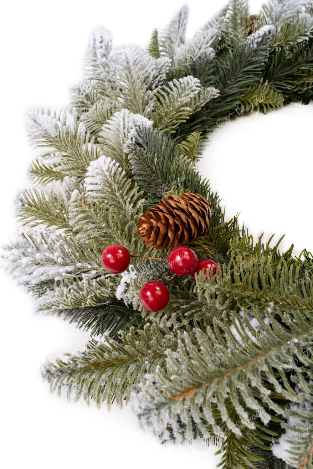 Po vzoru jednoho z našich nejprodávanějších stromků vznikl i samotný vánoční věnec 3D Jedle Zasněžená. Tento věnec je vytvořen kombinací PVC a 3D větviček, které jsou na koncích hustě zasněžené a doplněné o červené plody a šišky.