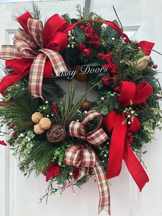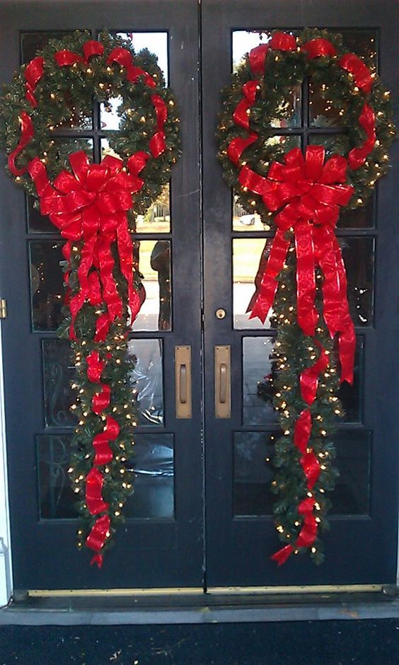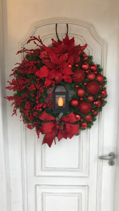 Skvělým tipem je také připevnit ze spolu věnce girlandu, která bude viset podél dveří a následně na věnec i girlandu připevnit hrubou červenou stuhu. Takový červený vánoční věnec na dveře bude zaručeně nepřehlédnutelný.