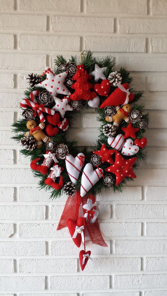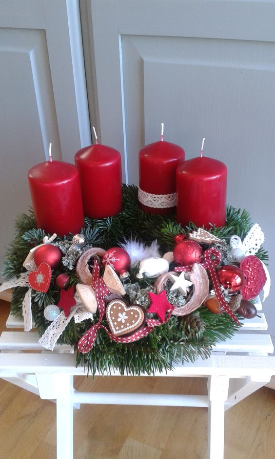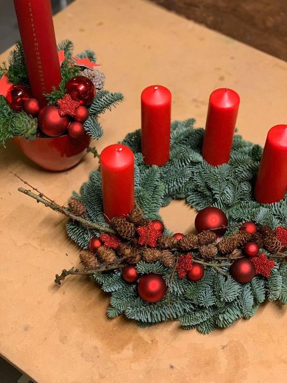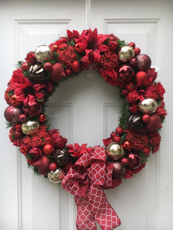 Červená barva k Vánocům zkrátka patří, a proto není divu, že se každoročně objevuje spousta vánočních dekorací v této barvě. Ozdoby červené barvy krásně ukáží na zeleném podkladu, proto bychom doporučovali zvolit čistý vánoční věnec celené barvy, který si následně dozdobíme červenými ozdobami. Vánoční věnec na dveře můžete dozdobit, červenými vánočními koulemi, červenými stuhami, květinami nebo jinými dekoracemi nejrůznějších tvarů. Červené ozdoby krásně ukáží pokud je nakombinujete se zlatými nebo bílými ozdobami.