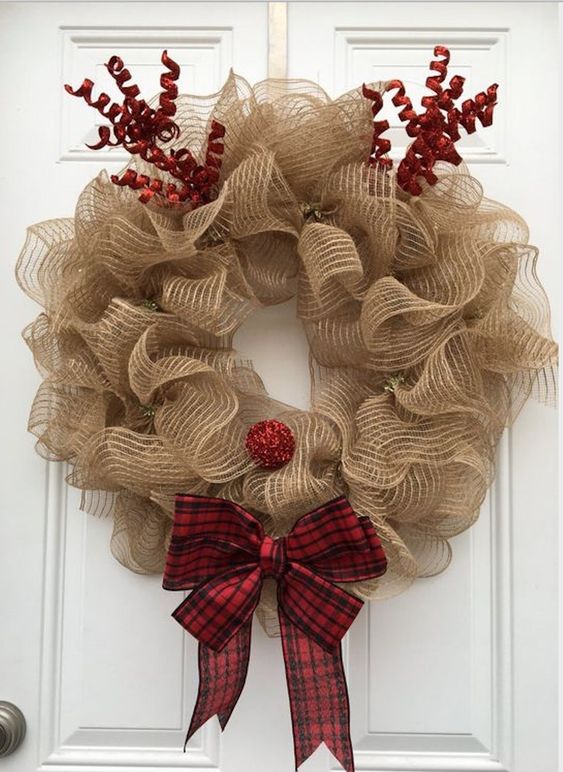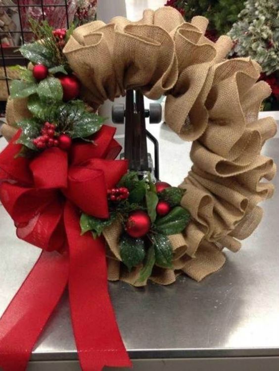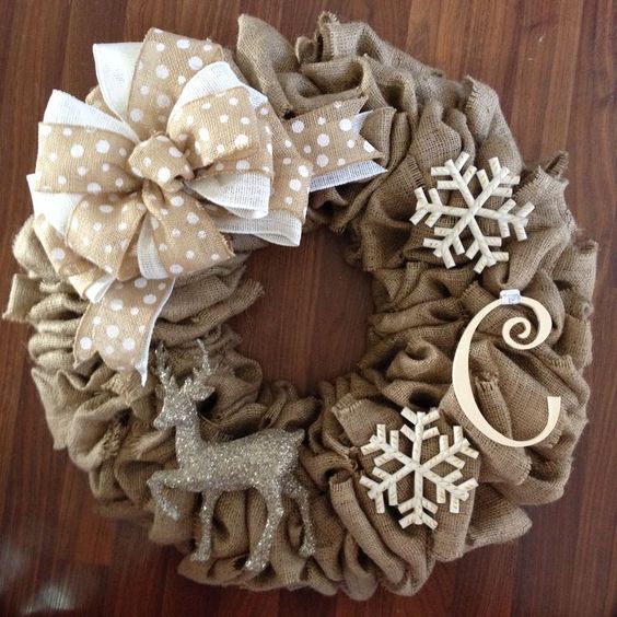 Netradiční vánoční věnec na dveře je také vánoční věnec z juty. Tento pytlovinový materiál jednoduše přilepte na čistou maketu věnce, nebo jej navlačte na kovovou, kruhovou konstrukci a krásný vánoční věnec na dveře je na světě. Dozdobit ho můžete ještě různými stuhami nebo dekoracemi.